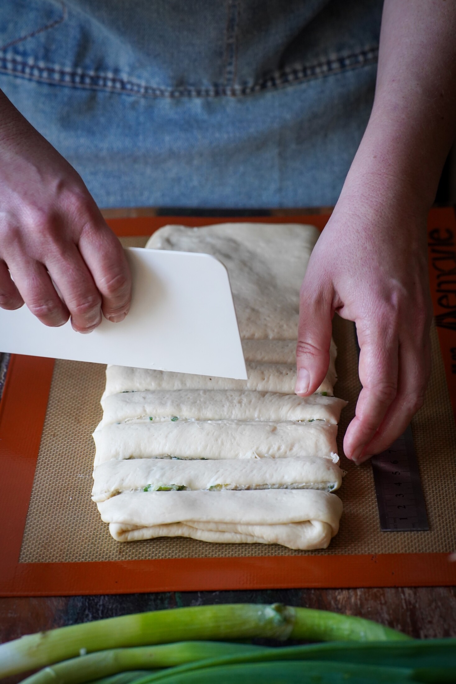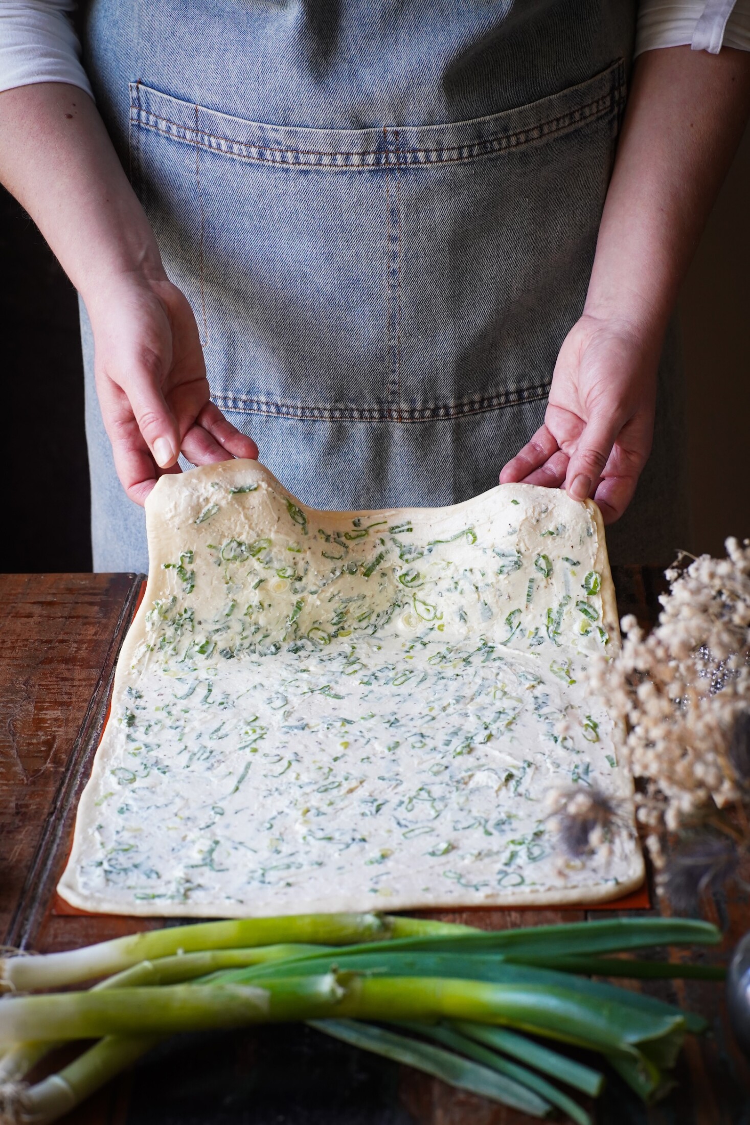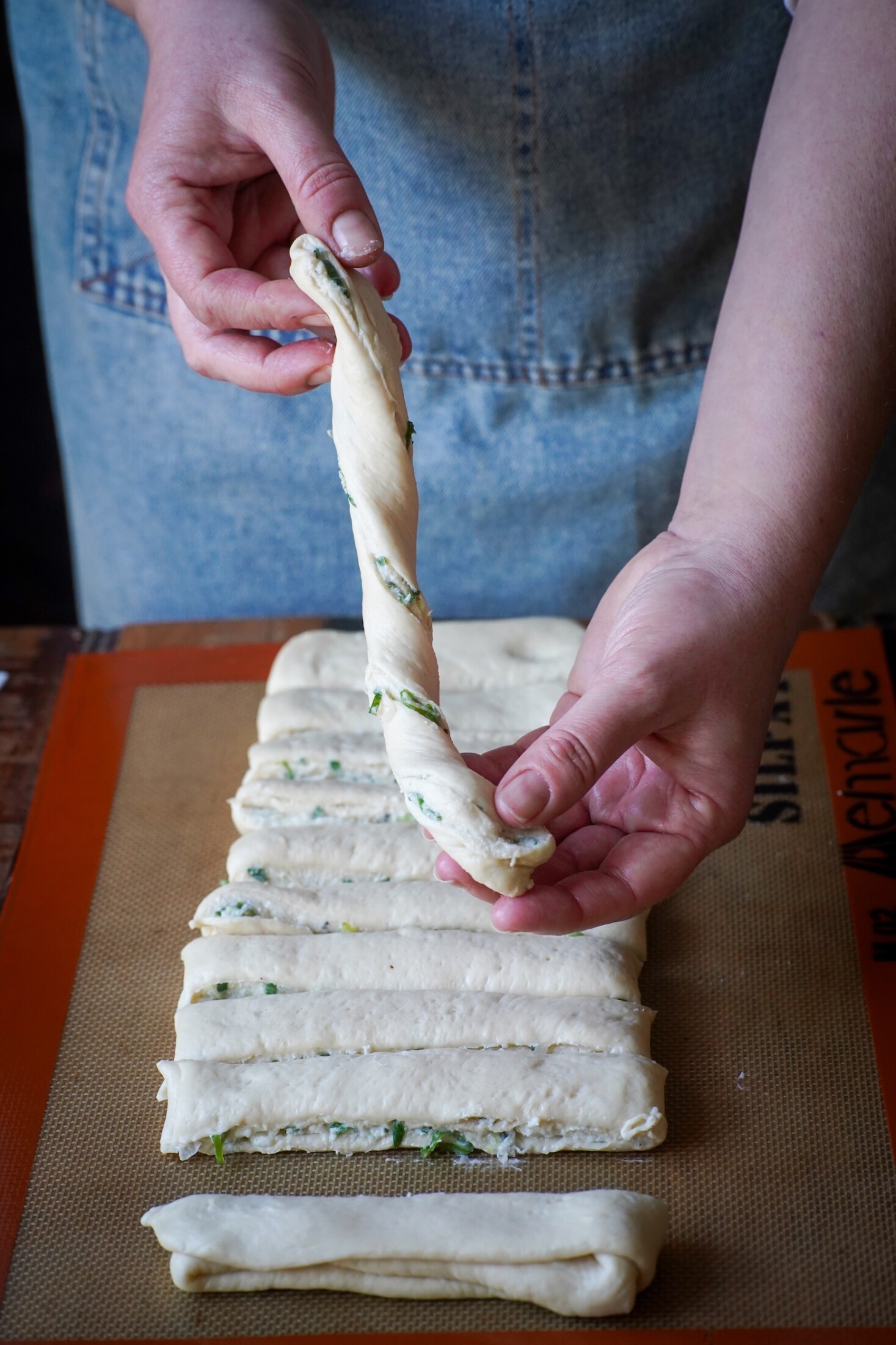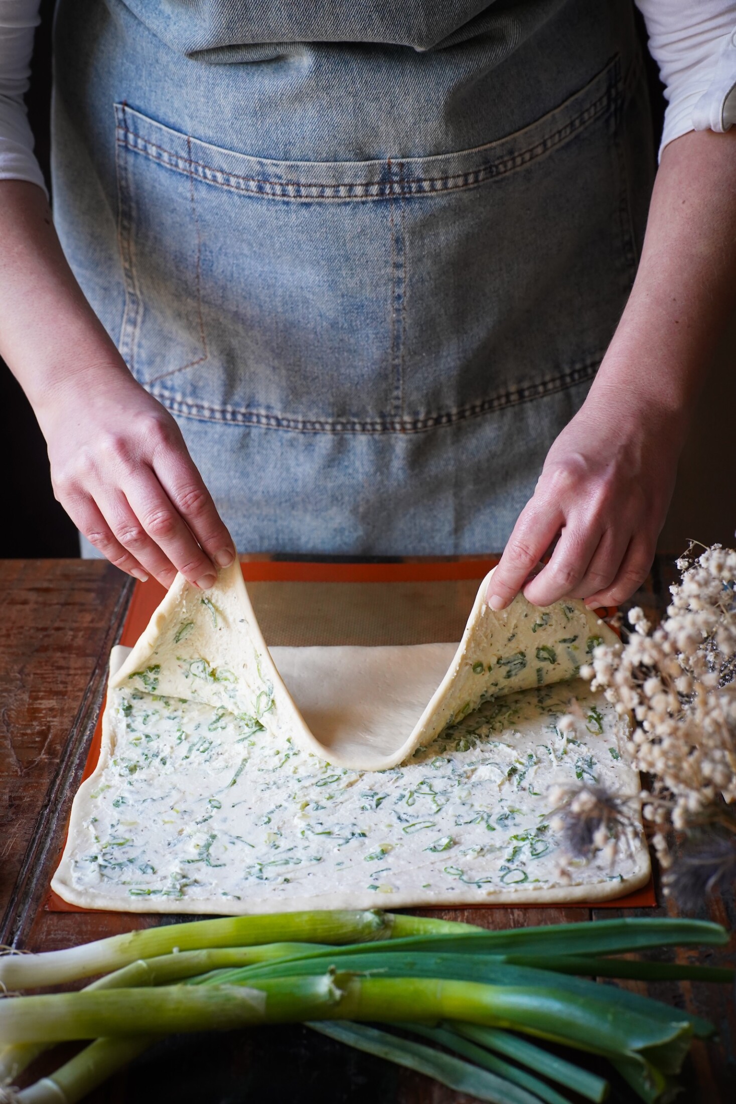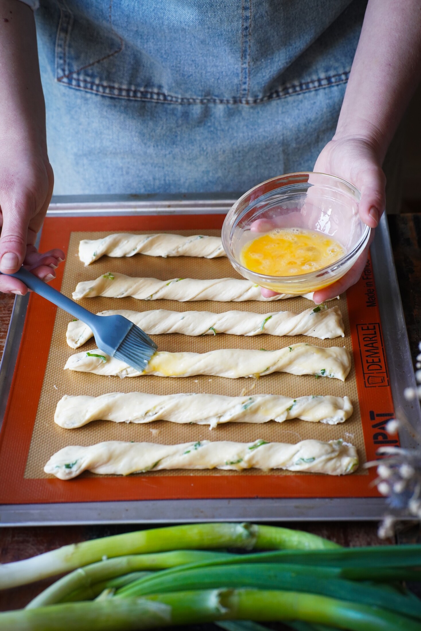Vykysnuté cesto preložte na pracovnú dosku a vyvaľkajte na obdĺžnik s rozmermi približne 40 × 30 cm. Rovnomerne naň rozotrite bryndzovú náplň. Cesto preložte (podľa postupu vo videu) a rozdeľte na 10 rovnakých podlhovastých pásov. Každý pás jemne natiahnite a zatočte do tvaru tyčinky. Tyčinky poukladajte na plech vystlaný papierom na pečenie, prikryte utierkou a nechajte ešte 10 minút podkysnúť.