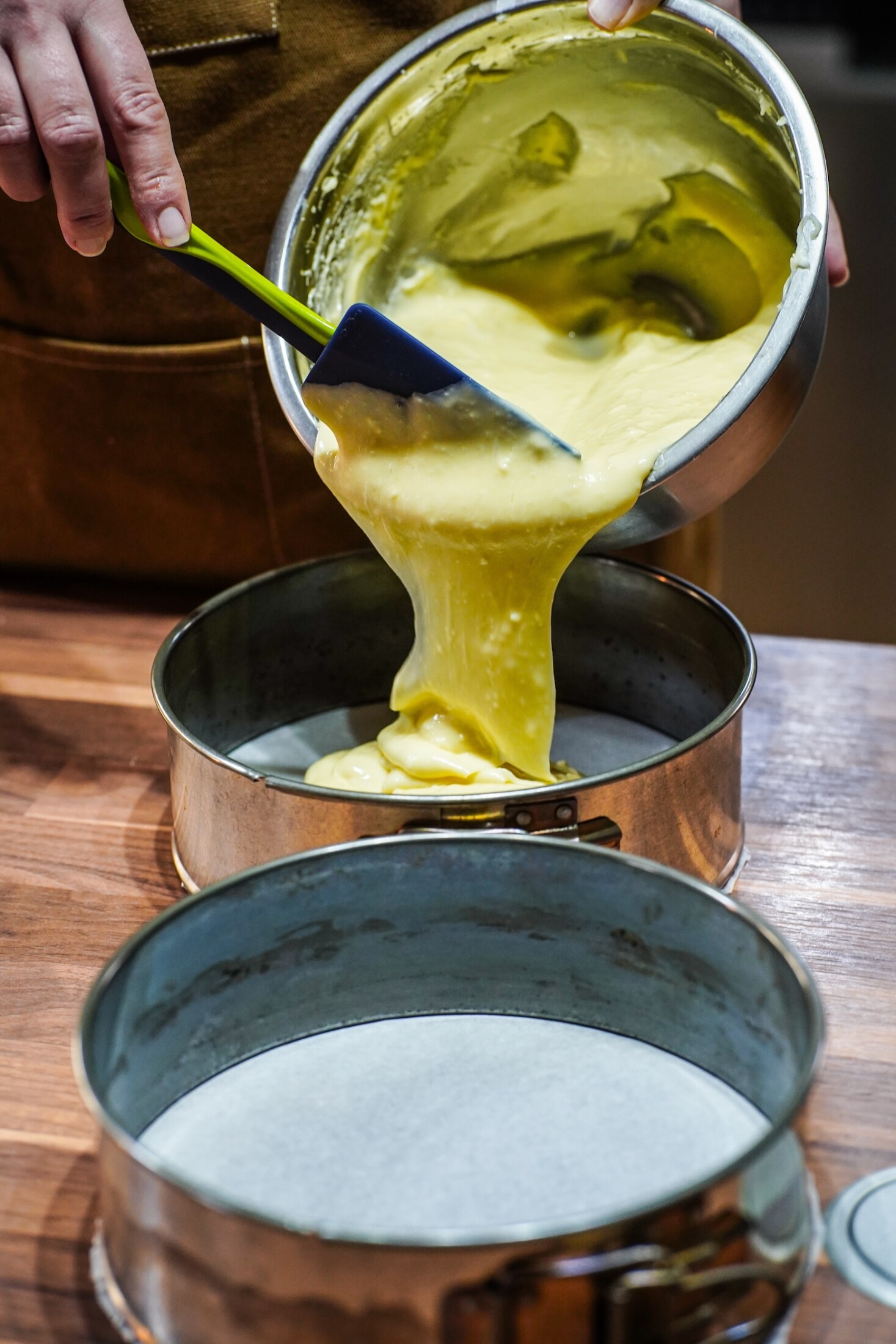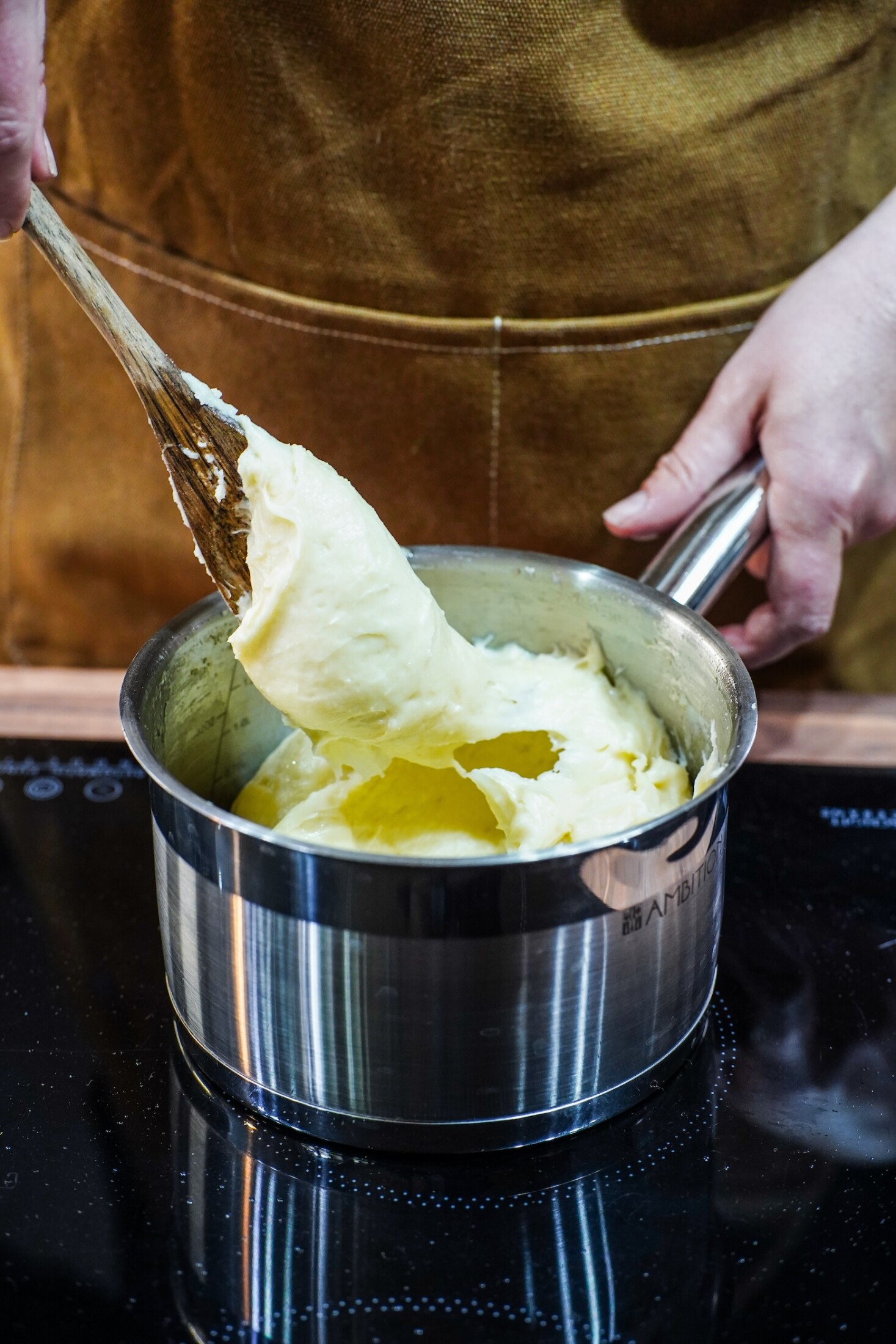Odpaľované cesto pripravíte veľmi jednoducho. V hrnci zohrejte mlieko, vodu, maslo, cukor a soľ, kým sa maslo úplne nerozpustí. Prisypte múku a vareškou riadne miešajte. Keď cesto zhustne a bude sa pekne odlepovať od stien hrnca, môžete ho odstaviť a nechať vychladnúť. Ak chcete proces chladenia urýchliť, preložte cesto do kuchynského robota a nechajte ho šľahať na nízkych otáčkach. Do vychladeného cesta izbovej teploty pridávajte vajcia jedno po druhom a šľahajte. Pripravte dve formy s priemerom 20 cm. Papierom na pečenie vysteľte iba spodnú časť foriem a nalejte do nich cesto. Pečte pri teplote 200 stupňov 25 minút.
