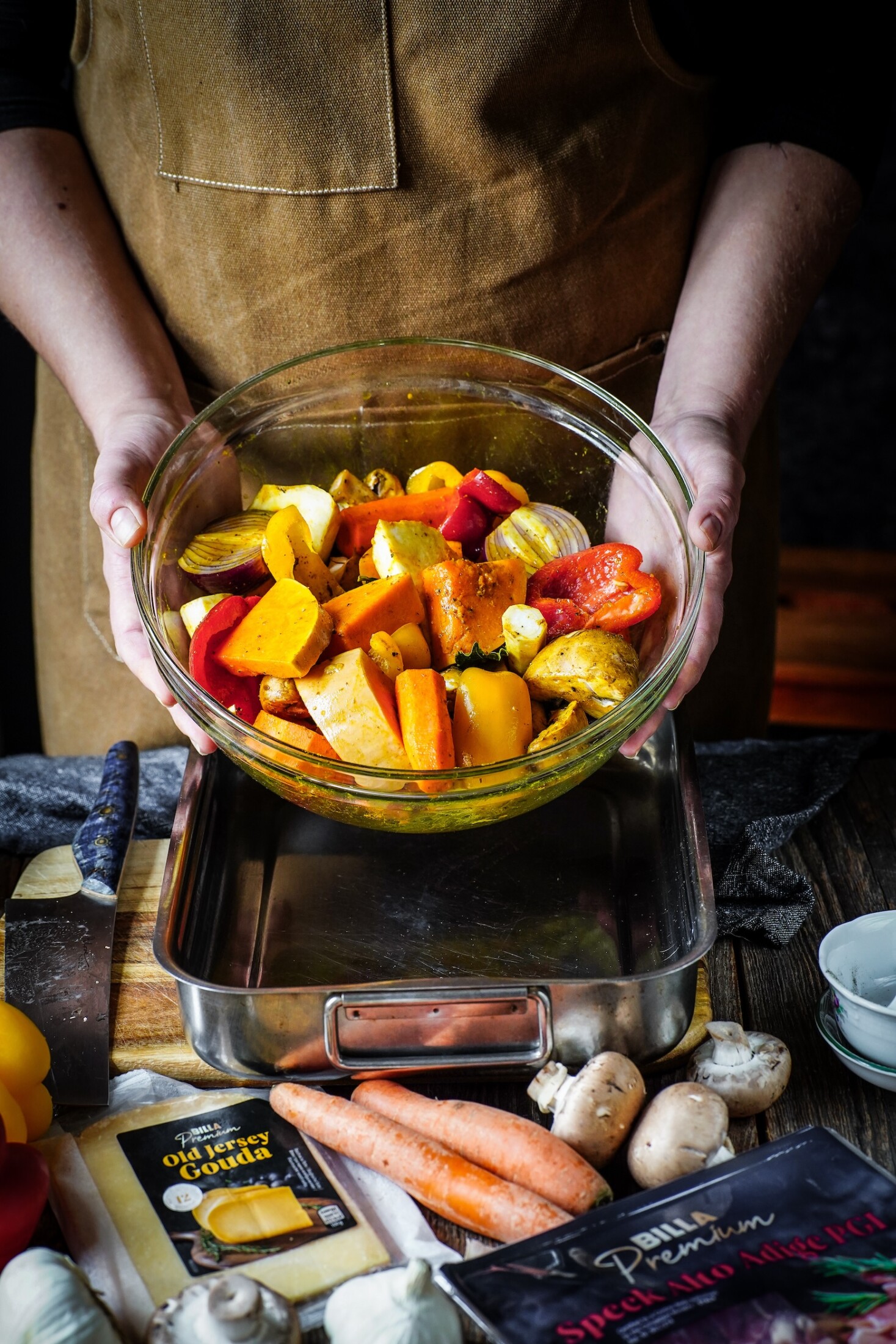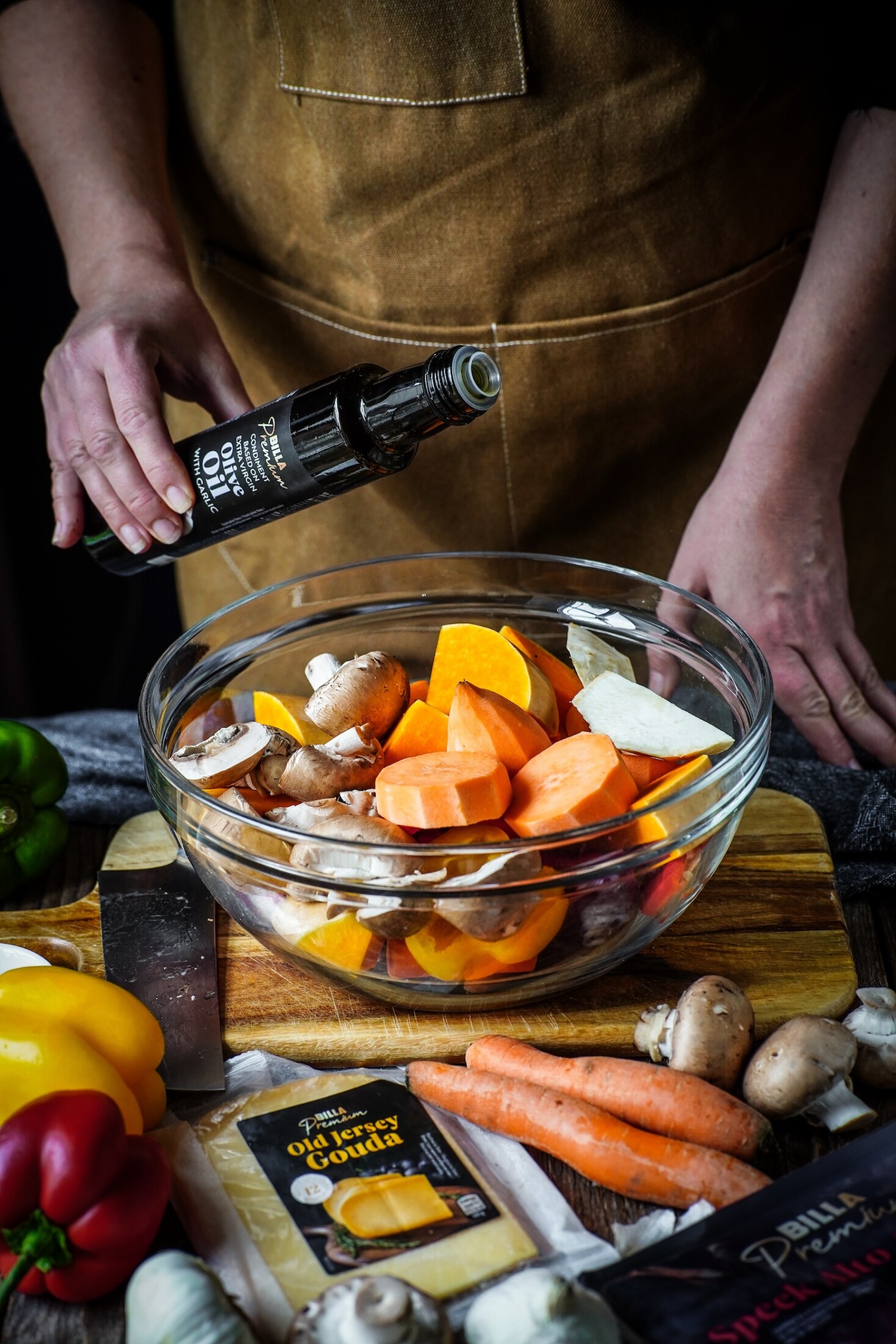 Dochutenie a varenie: Upečenú zeleninu vložte do hrnca, zalejte litrom zeleninového vývaru a krátko povarte, aby sa chute spojili.