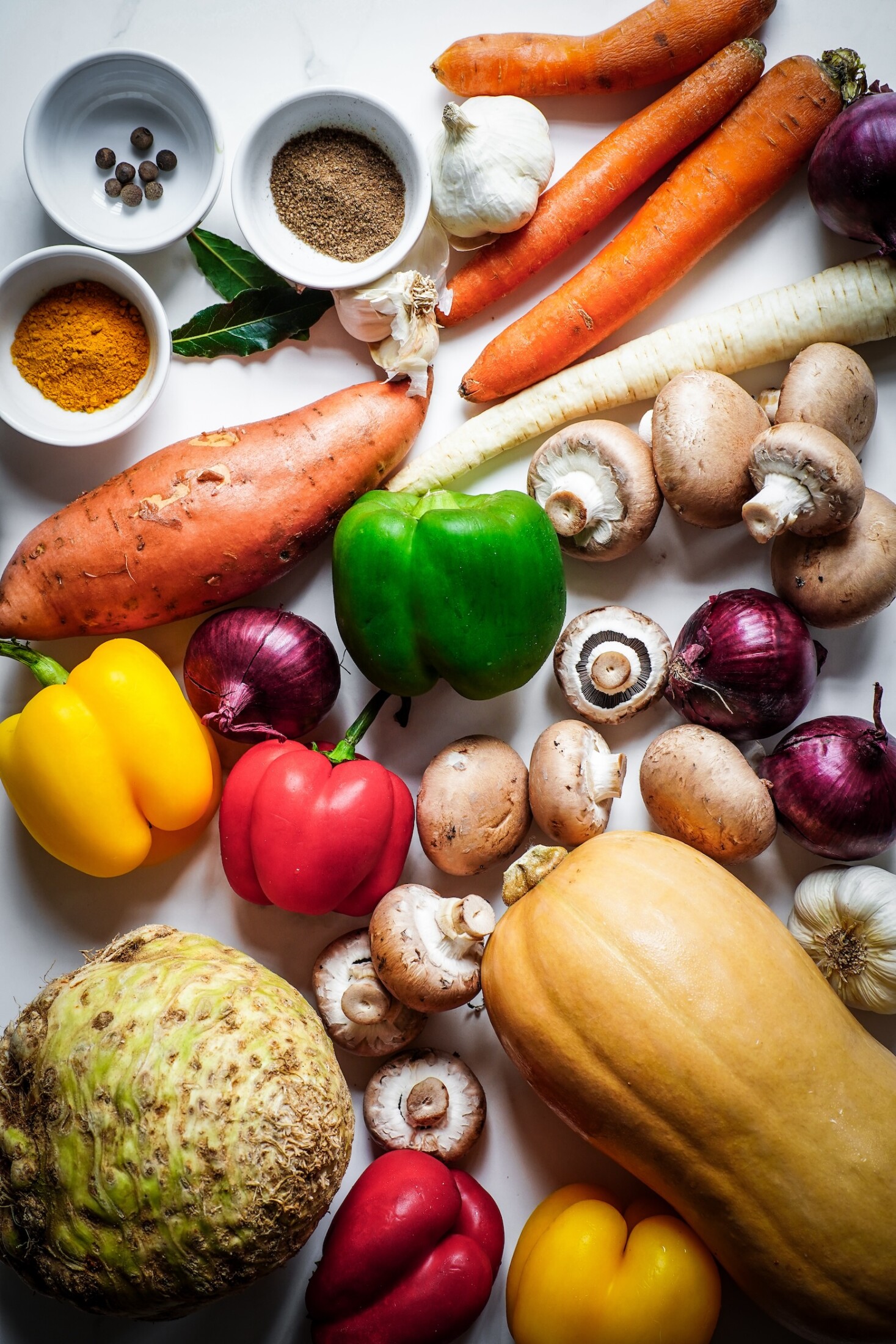 Pripravte zeleninu: Cibuľu, papriky, batat, mrkvu, petržlen, zeler a šampiňóny očistite a nakrájajte na približne rovnaké kúsky. Cesnak ošúpte.