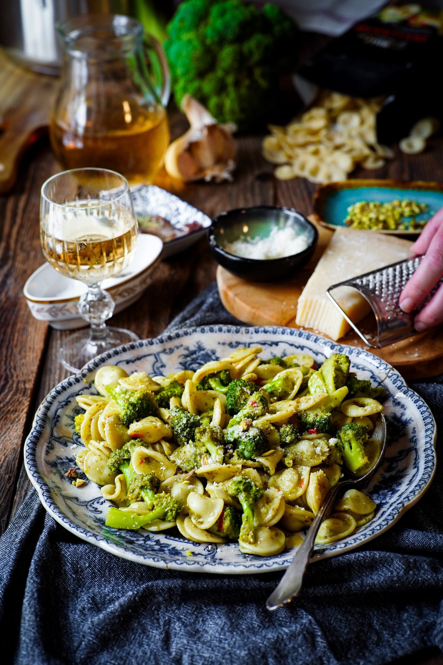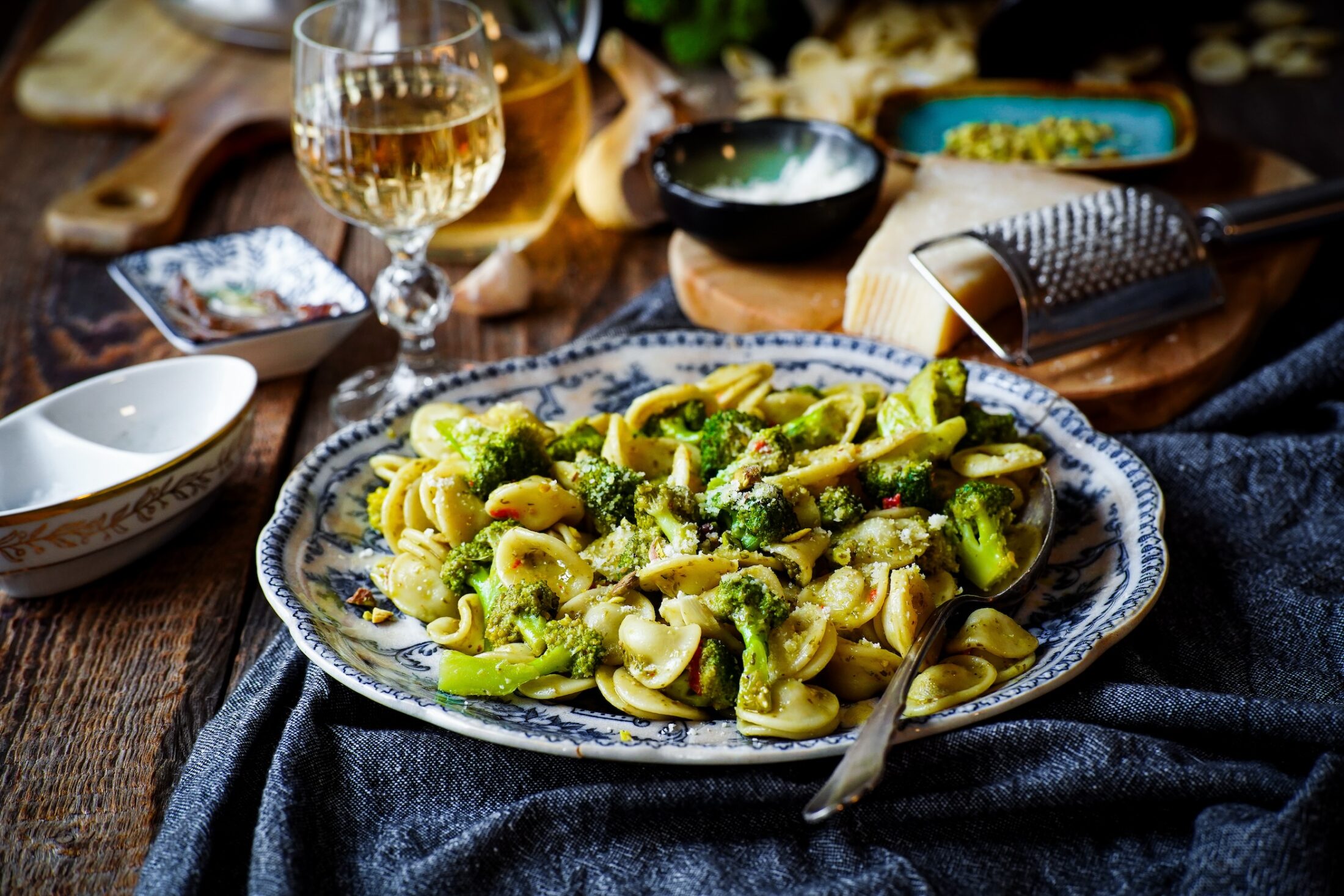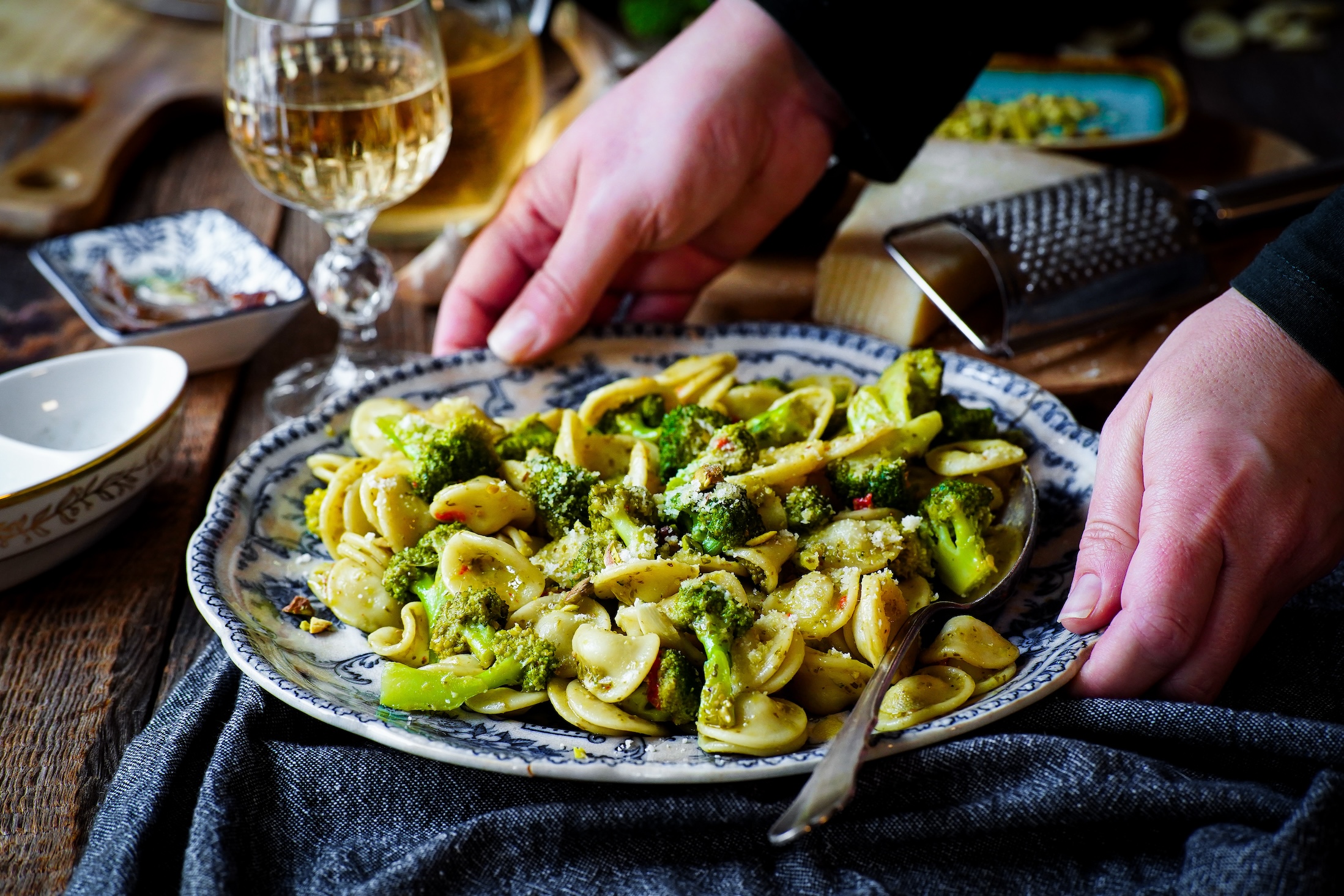 Orecchiette sú tradičné talianske cestoviny z regiónu Apúlia (Puglia) v južnom Taliansku. Ich názov znamená „malé ušká“ – tvar je ideálny na zachytávanie omáčok a kúskov zeleniny, takže každé sústo je dokonale ochutené. V kombinácii s jemne chrumkavou brokolicou, aromatickým pestom, pikantnou chilli a slanosťou ančovičiek vzniká jedlo, ktoré je jednoduché, ale pritom sofistikované.