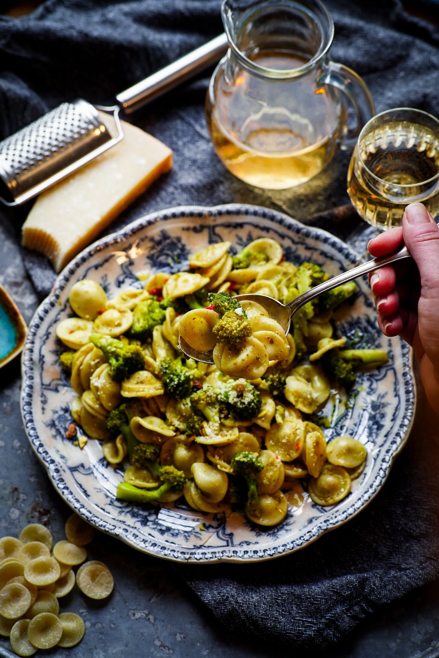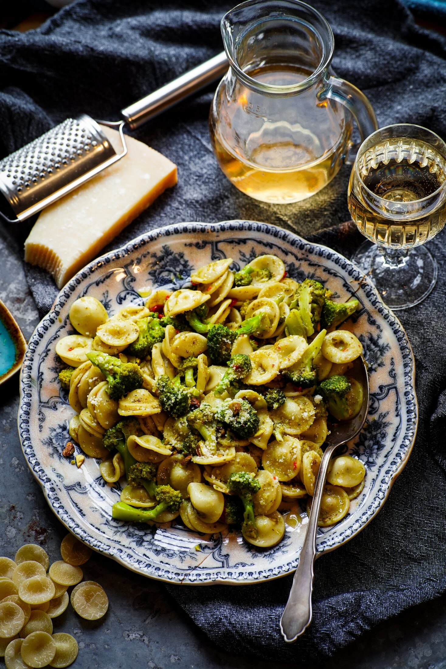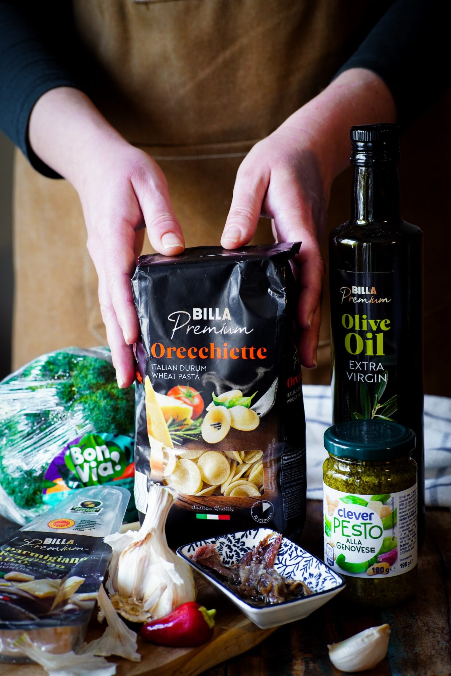 Orecchiette sú tradičné talianske cestoviny z regiónu Apúlia (Puglia) v južnom Taliansku. Ich názov znamená „malé ušká“ – tvar je ideálny na zachytávanie omáčok a kúskov zeleniny, takže každé sústo je dokonale ochutené. V kombinácii s jemne chrumkavou brokolicou, aromatickým pestom, pikantnou chilli a slanosťou ančovičiek vzniká jedlo, ktoré je jednoduché, ale pritom sofistikované.