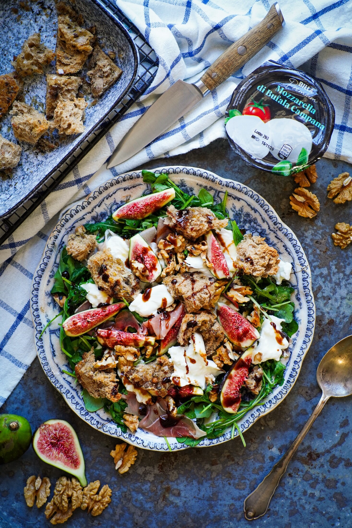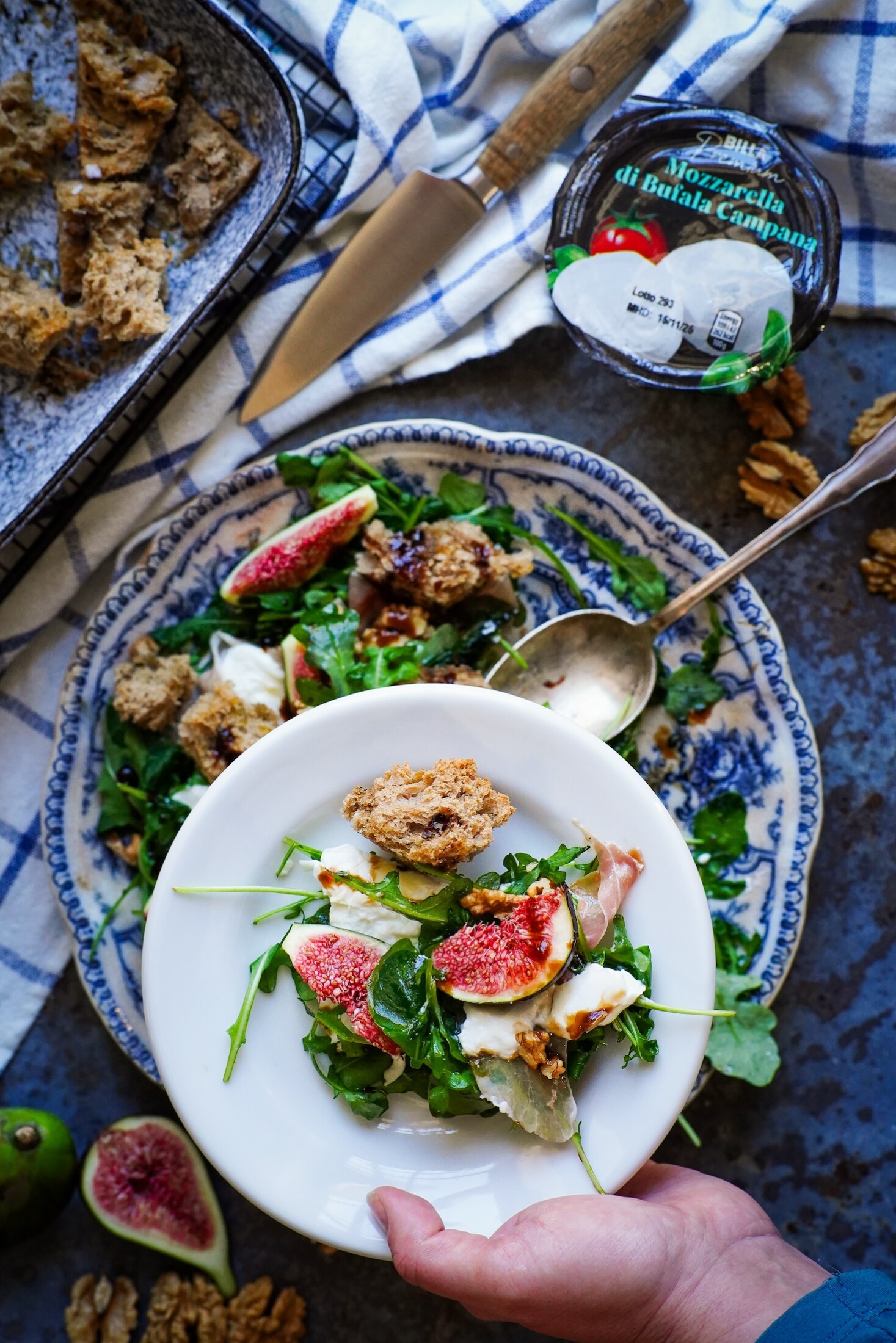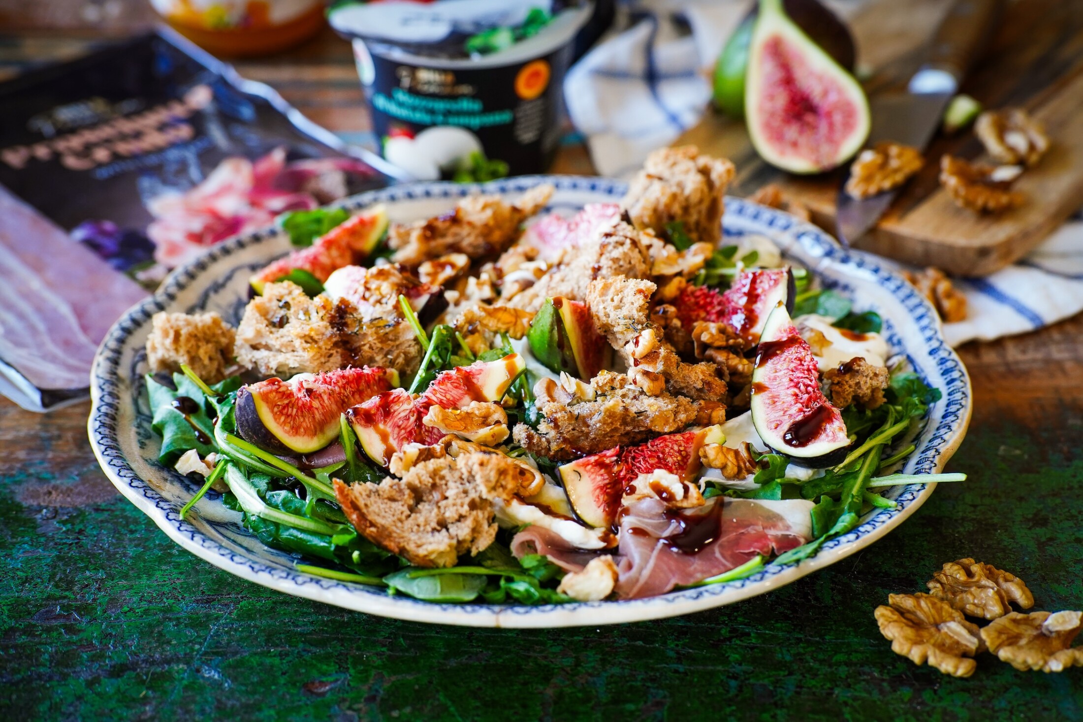 Rukola dodá pikantný základ, figy prinesú jemnú sladkosť, mozzarella mäkkosť a prosciutto všetko krásne zaobalí slanou harmóniou. K tomu chrumkavé krutóny a opražené vlašské orechy… no povedzte, čo viac sa hodí k jesennému lenivému dopoludniu?