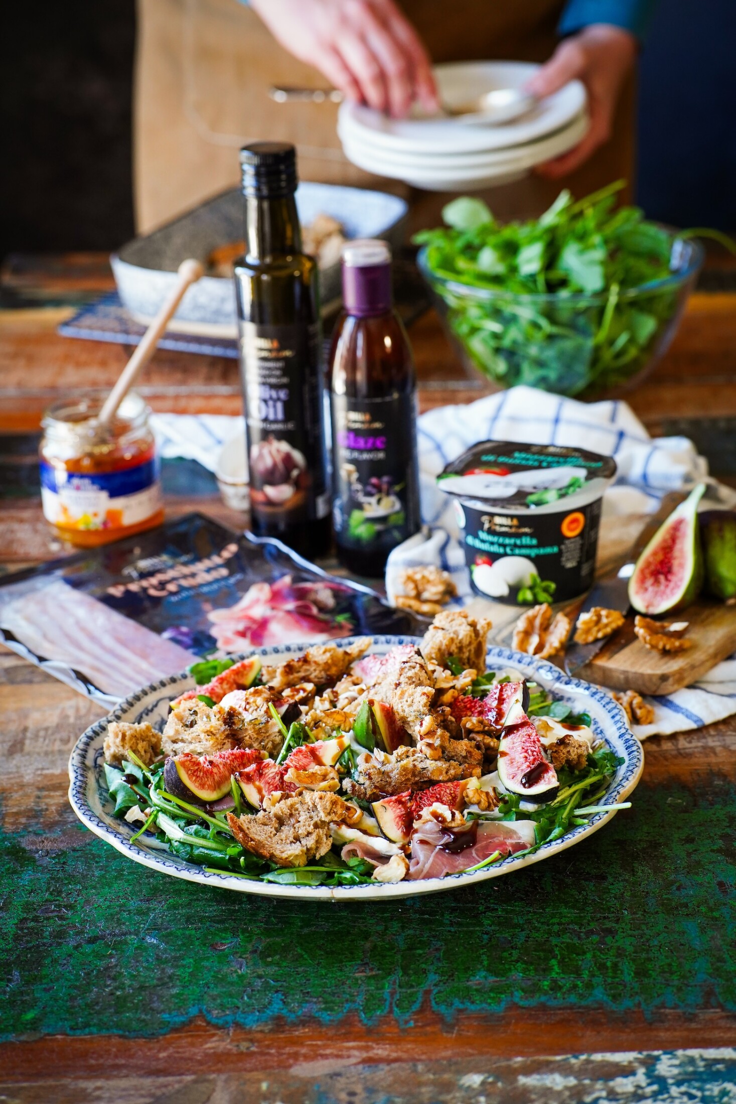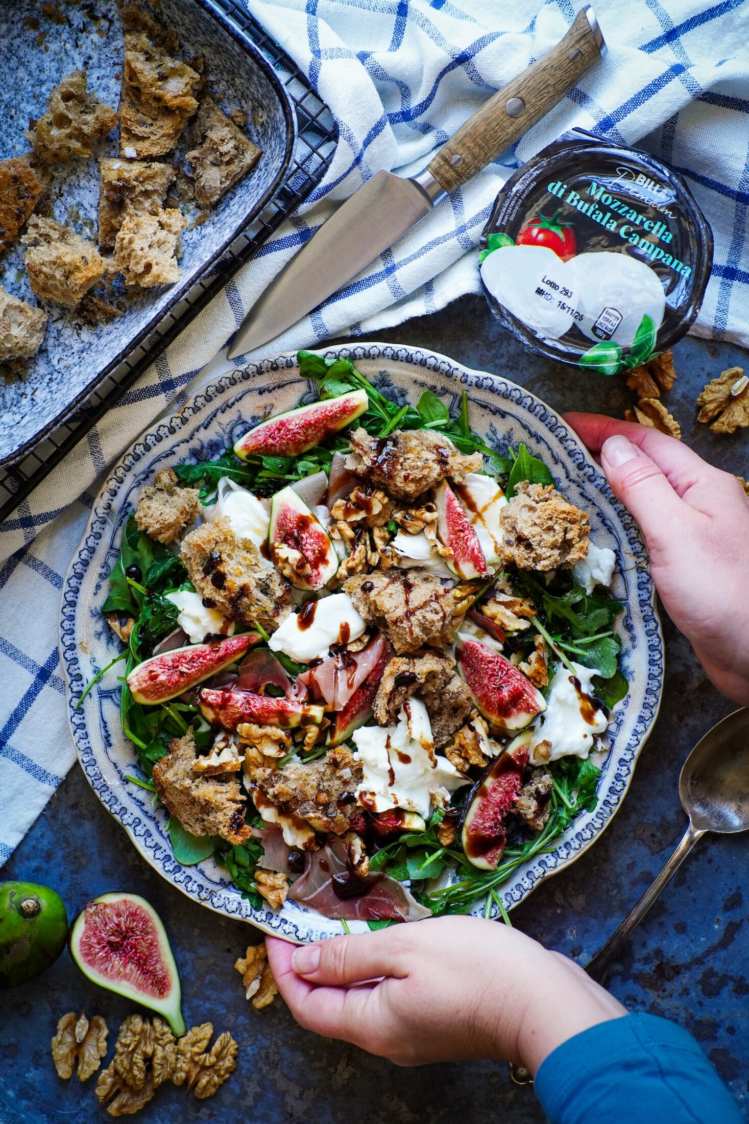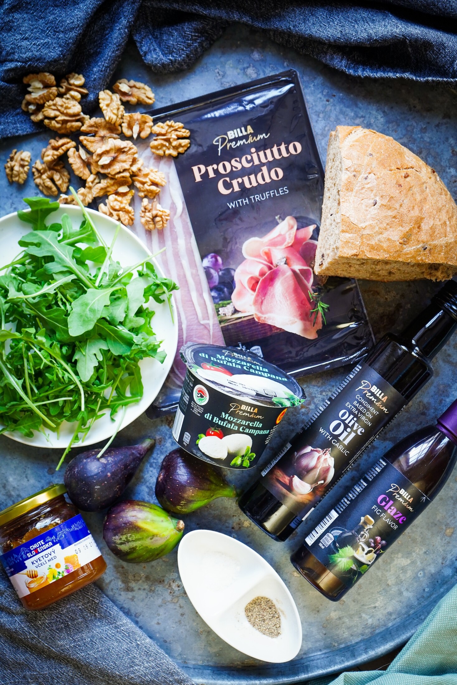 Rukola dodá pikantný základ, figy prinesú jemnú sladkosť, mozzarella mäkkosť a prosciutto všetko krásne zaobalí slanou harmóniou. K tomu chrumkavé krutóny a opražené vlašské orechy… no povedzte, čo viac sa hodí k jesennému lenivému dopoludniu?