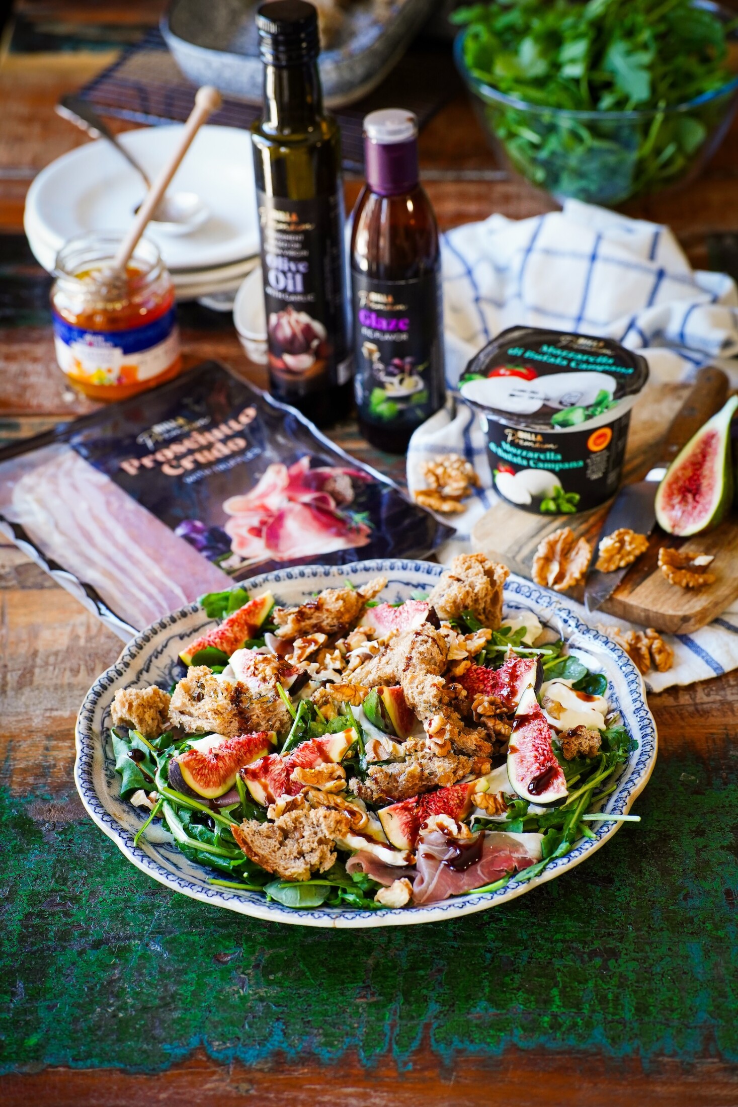 Na tanier uložte rukolu, dochuťte ju olivovým olejom, citrónovou šťavou, soľou a korením. Dobre premiešajte. Na rukolu postupne uložte natrhané prosciutto, natrhanú mozzarellu, kúsky fíg, krutóny a orechy. Šalát prelejte medom a balzamikovým glazé. Takýto šalát sa hodí ako jedlo na brunch, podávaný na vašom najkrajšom servise s pohárom prosecca.