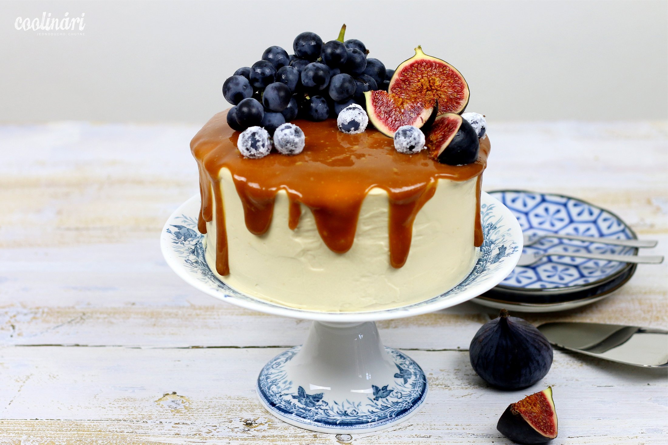 - V hrnci roztopte cukor, kukuričný sirup a vodu. Chvíľku to potrvá, kým sa voda odparí, ale buďte trpezliví. Ihneď keď karamel dosiahne teplotu 110 stupňov, zalejte ho smotanou. Opäť ho za stáleho miešania zahrievajte, pridajte soľ, čakajte kým nedosiahne teplotu 100 stupňov a odstavte. Prelejte cez sito, aby v poleve neostala ani jedna hrudka a nechajte chvíľu chladnúť. Tortu nechajte aspoň 15 minút pred nanášaním polevy v mrazničke. V prípade, že sa vám už nechce babrať s ďalším karamelom, pokojne použite ako polevu jednu štvrtinu s pôvodného krému Dulce de leche. Bude trochu redšia, ale na chuti jej to neuberie. Dozdobte sezónnym ovocím. Ja som použila figy a hrozno, ktoré sa k tejto Dulce de leche torte nesmierne hodili.