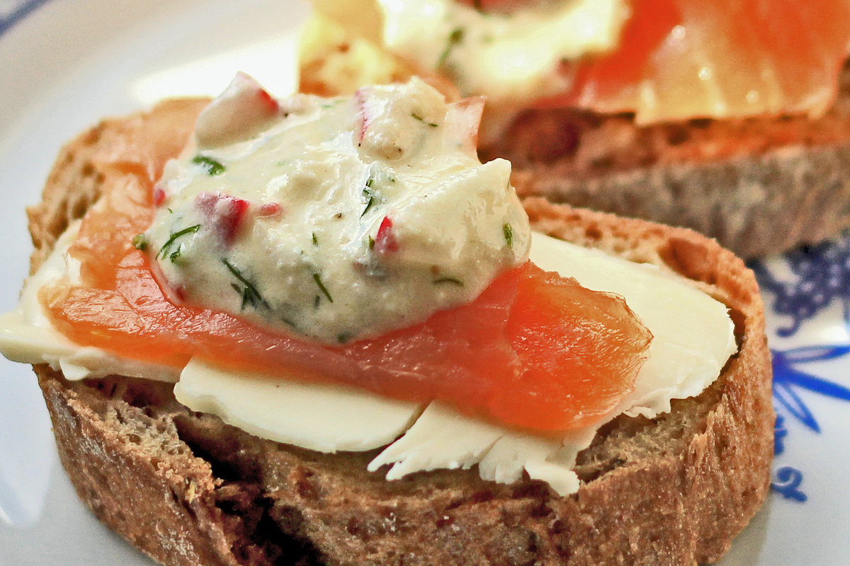 - Pečivo narežte na malé krajce, potrite kúskom masla, uložte plátok lososa a na každý pridajte poriadny kus dresingu. Fantastické!!